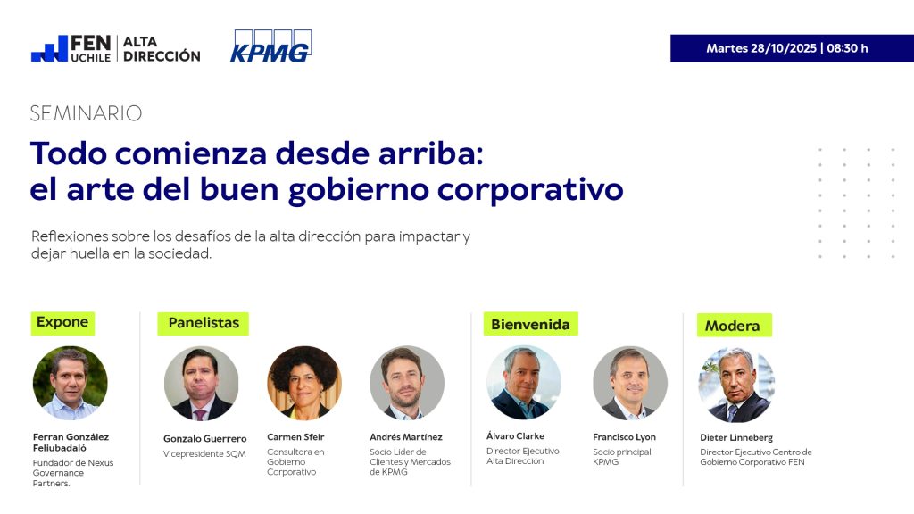 Reflexiones sobre los desafíos de la alta dirección para impactar y dejar huella en la sociedad. Fecha: Martes 28 de octubre de 2025 Hora: 08:30 horas Lugar: Sede Alta Dirección FEN, Av. Apoquindo 6550, Edificio Génesis, Piso 9, Las Condes Formato: Presencial. Cupos limitados Palabras de bienvenida: -Álvaro Clarke, Director Ejecutivo Alta Dirección FEN -Francisco Lyon, Socio principal KPMG…